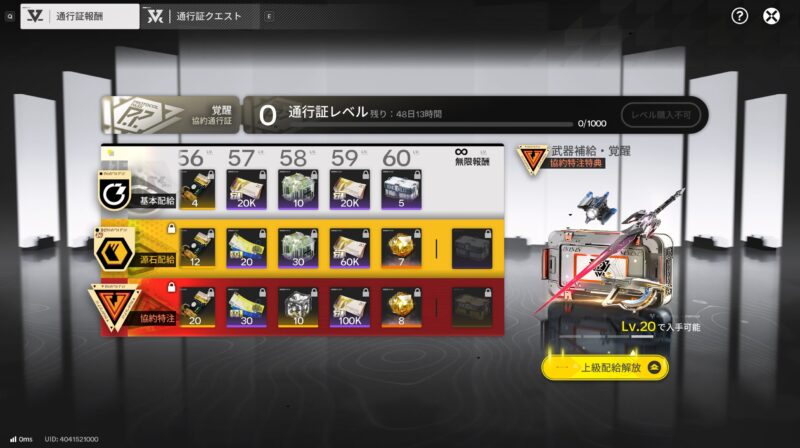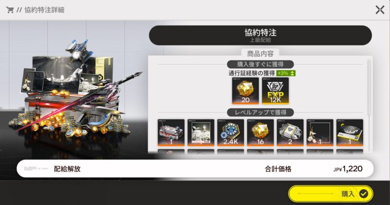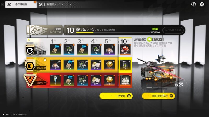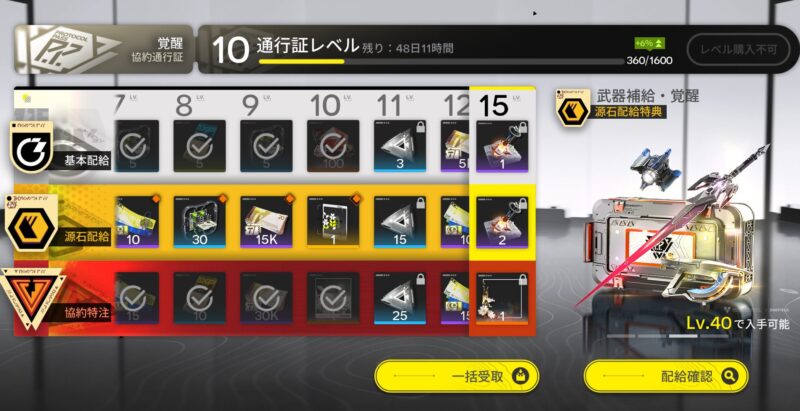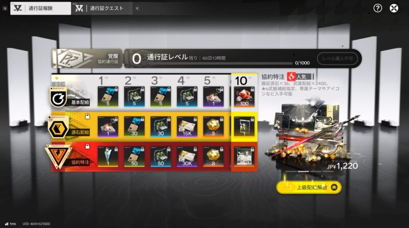 例えば、協約通行証の『協約特注』を解放すれば、クエスト報酬で武庫配給が2,400もらえます。