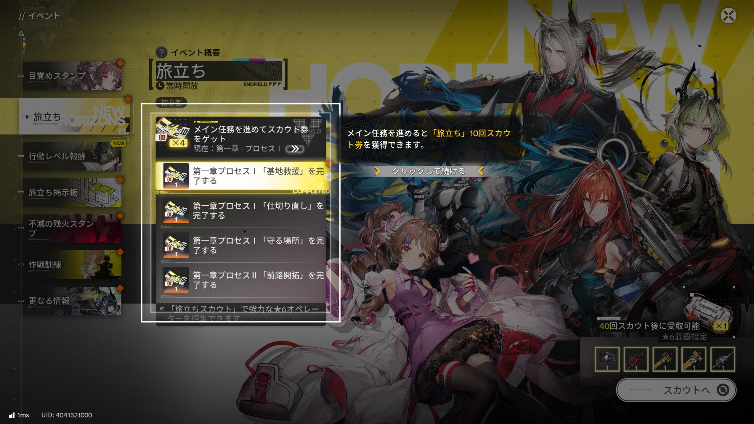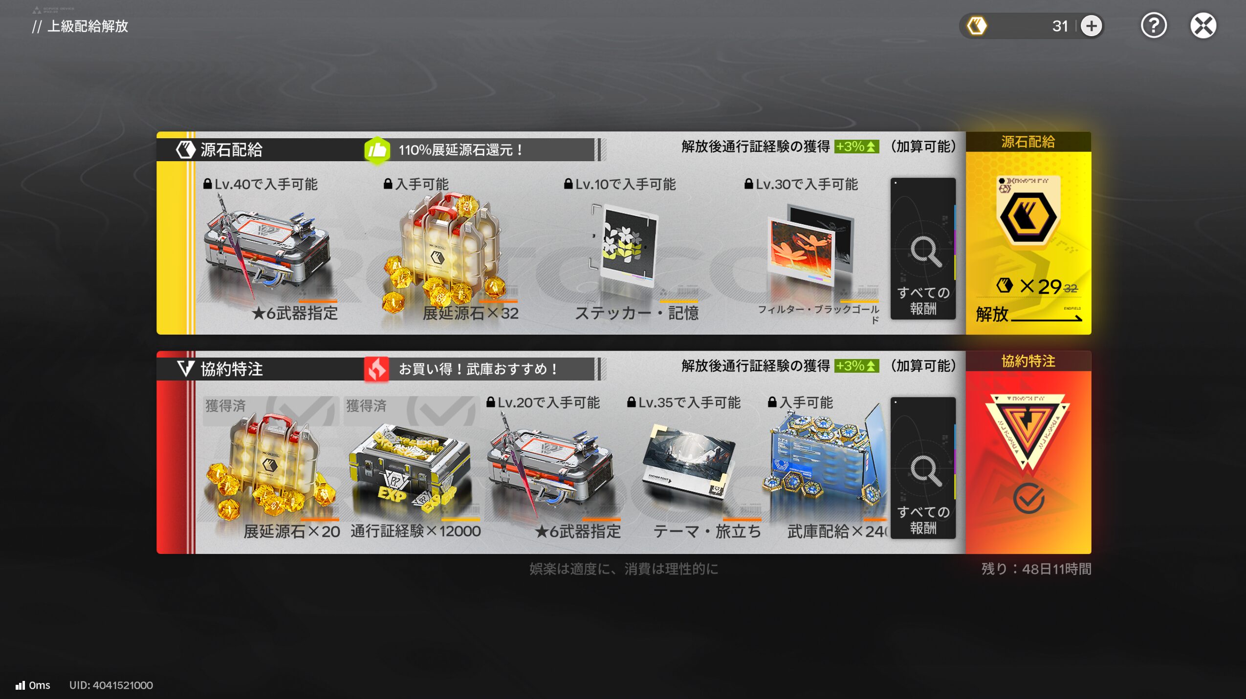 源石配給:展延源石で解放可能。※石があれば無料でも解放できます。