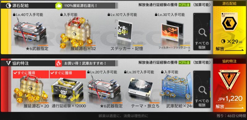 協約通行証(シーズンパス)の報酬を確認すると、結構いい感じのアイテムがラインナップされていました。
