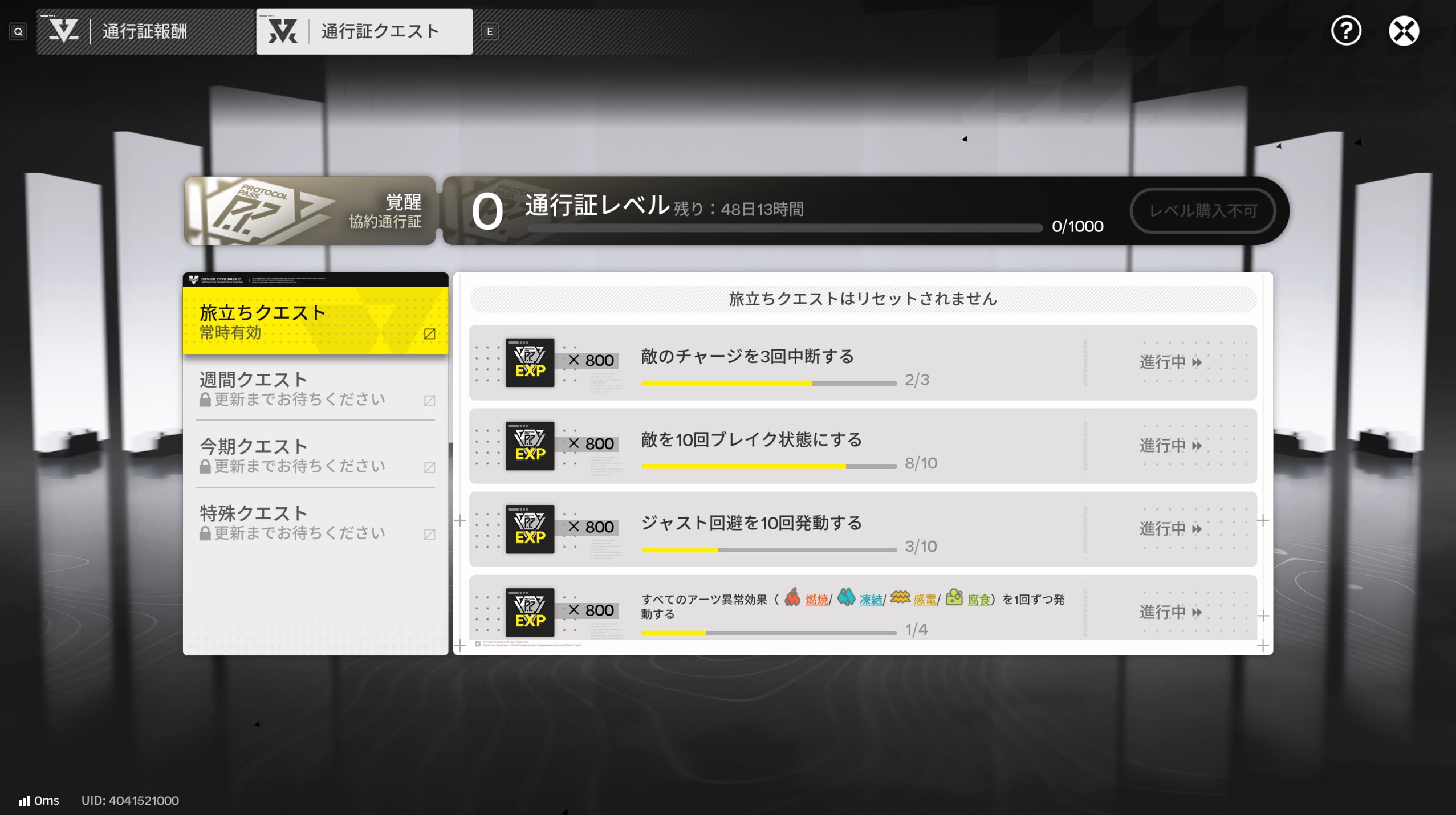 クエストを何も消化していない初期状態のままで、通行証レベルが10まで上がります。