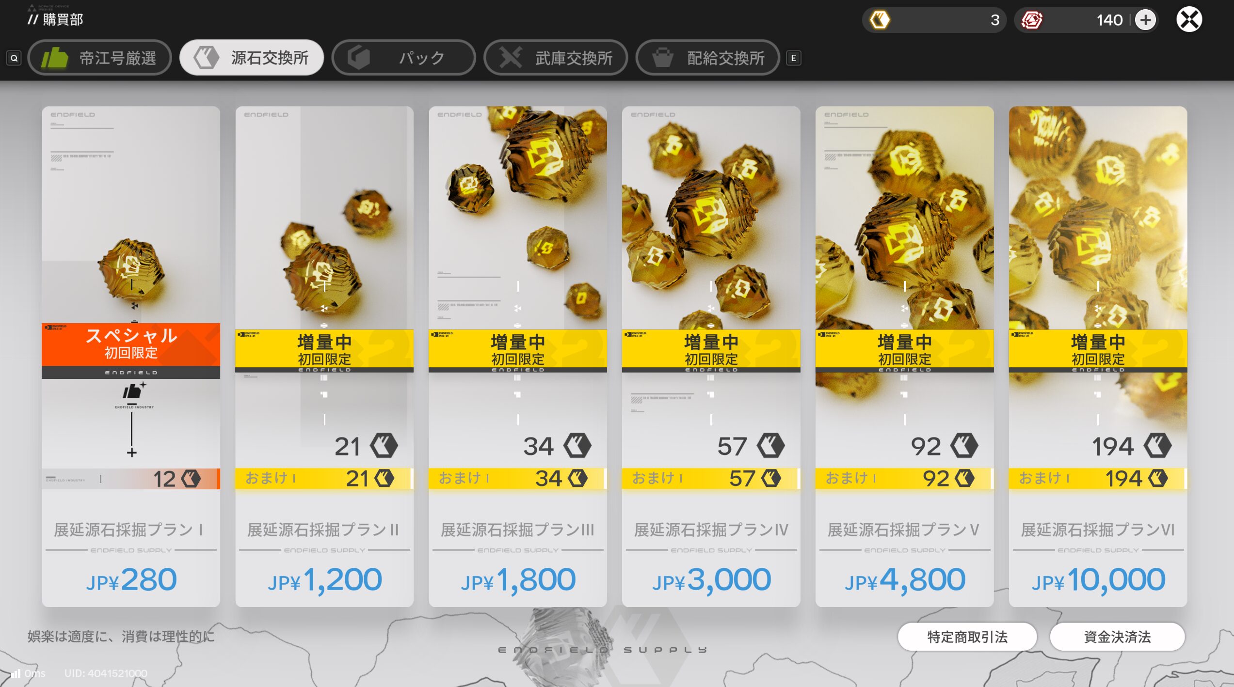 アークナイツ:エンドフィールドでの課金は、以下より選択できます。