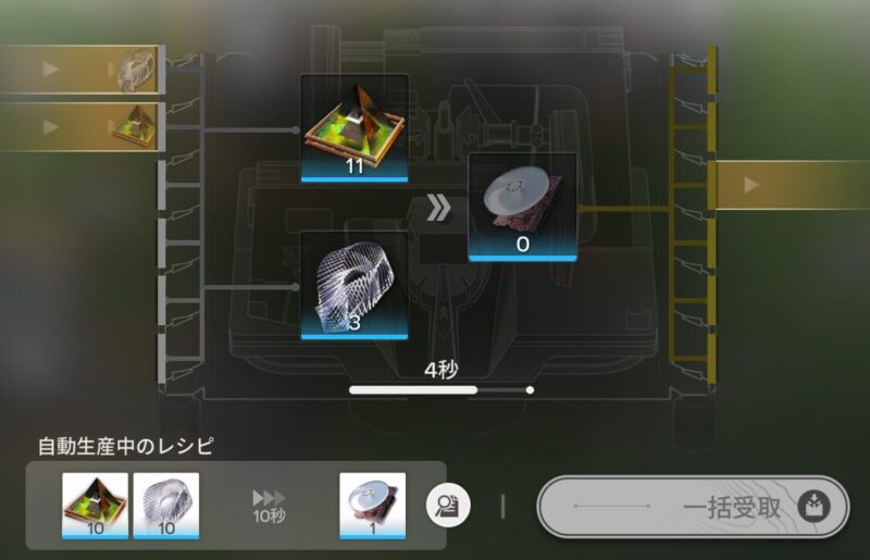 特製結晶:10コ+高晶繊維:10コ➔装備部品加工機(2秒)➔高晶装備部品:1コ