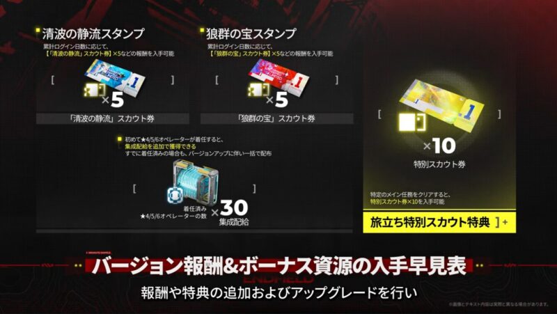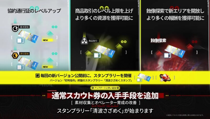 また、協約通行証、商品取引所、蝕像探索にて通常スカウト券が追加入手できるようになります。