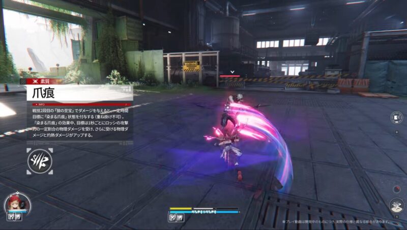 クラッシュ状態の敵に命中した場合、追加ダメージを与え、目標に「染まる爪痕」を残し、一定時間持続ダメージを与える。