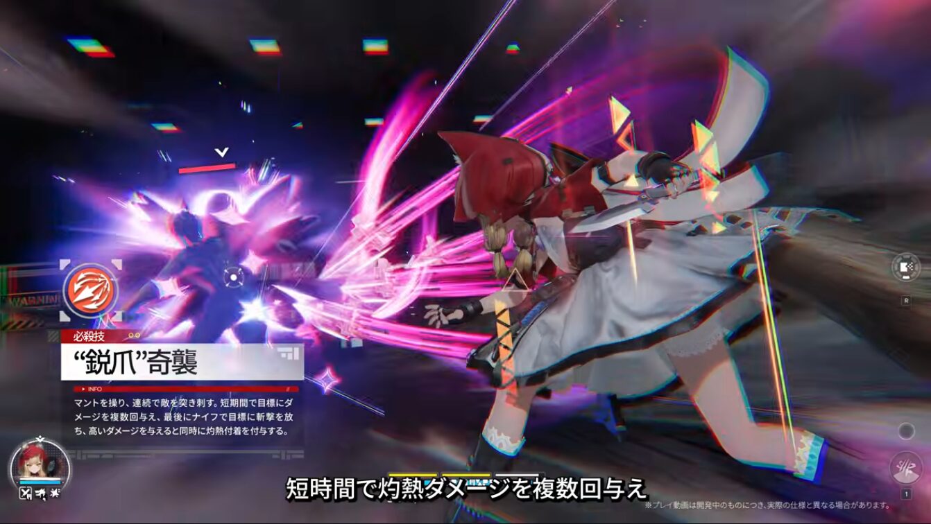 短期間で目標にダメージを複数回与え、最後にナイフで目標に斬撃を放ち、高いダメージを与えると同時に灼熱付着を付与する。