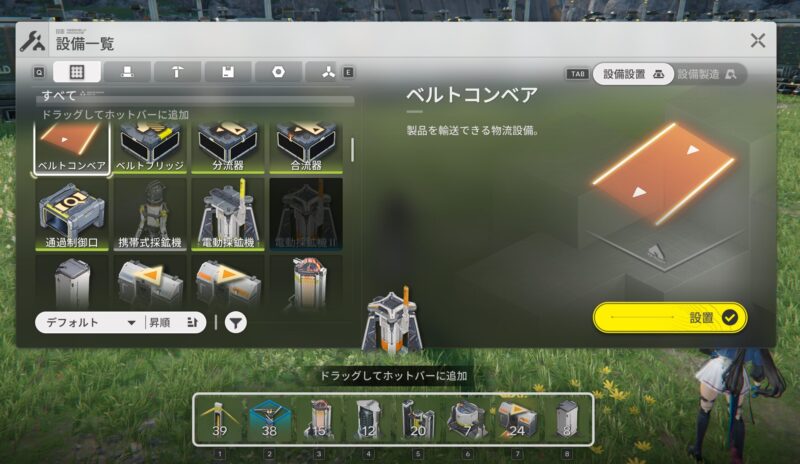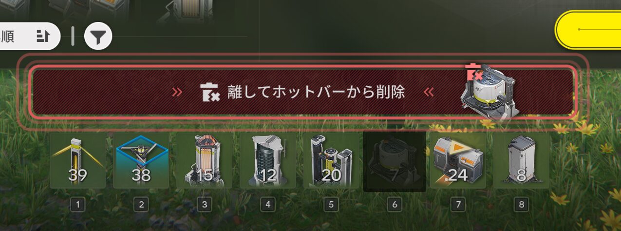 また、ホットキーの設備を削除したい場合は、登録してあるホットバーの設備をドラッグして何も無いところで離せばOKです。