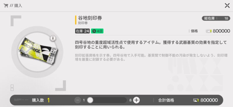 商品取引所の定価商品には『谷地刻印券』が販売されています。