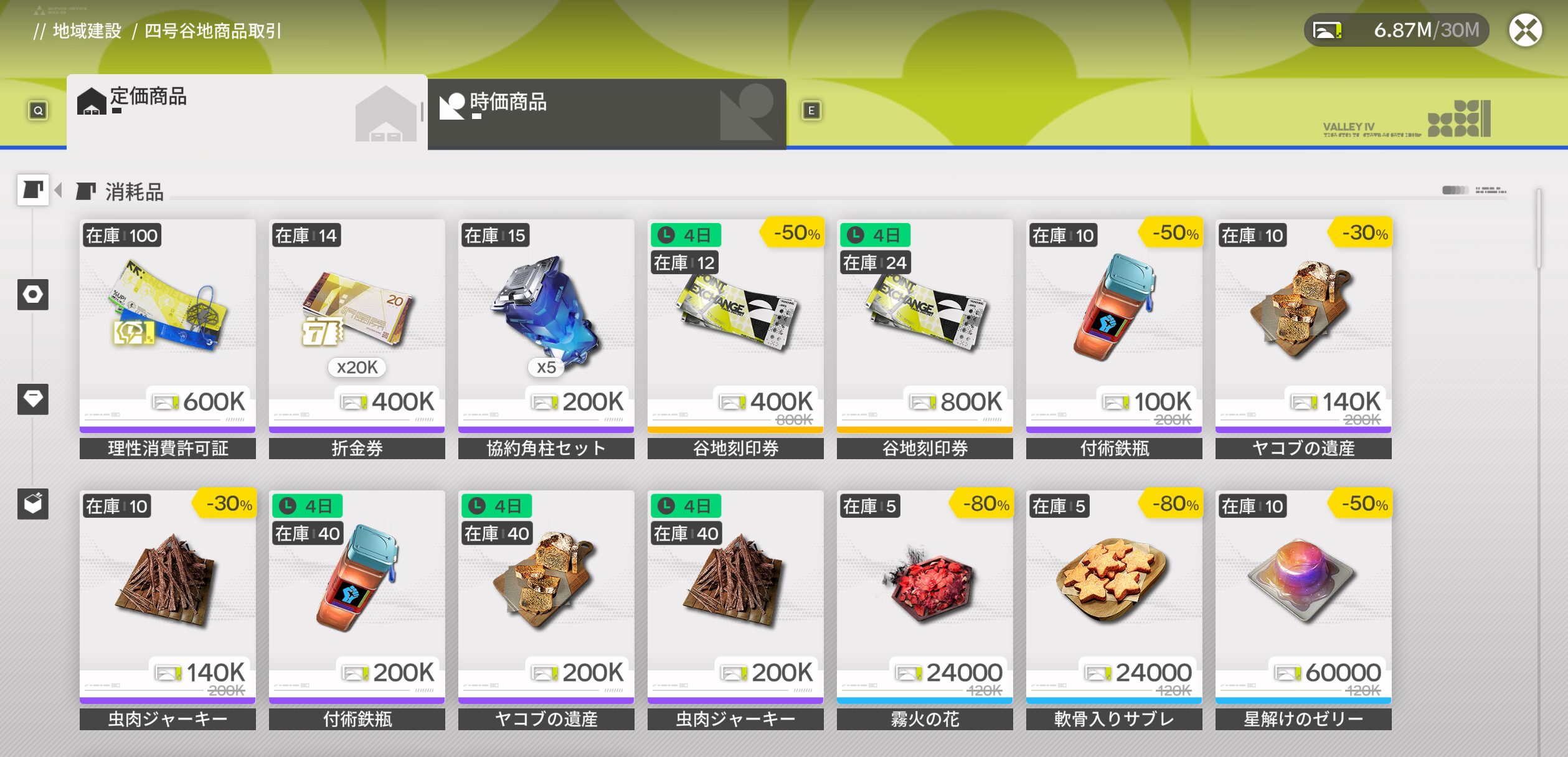 商品取引所の定価商品には『谷地刻印券』が販売されています。
