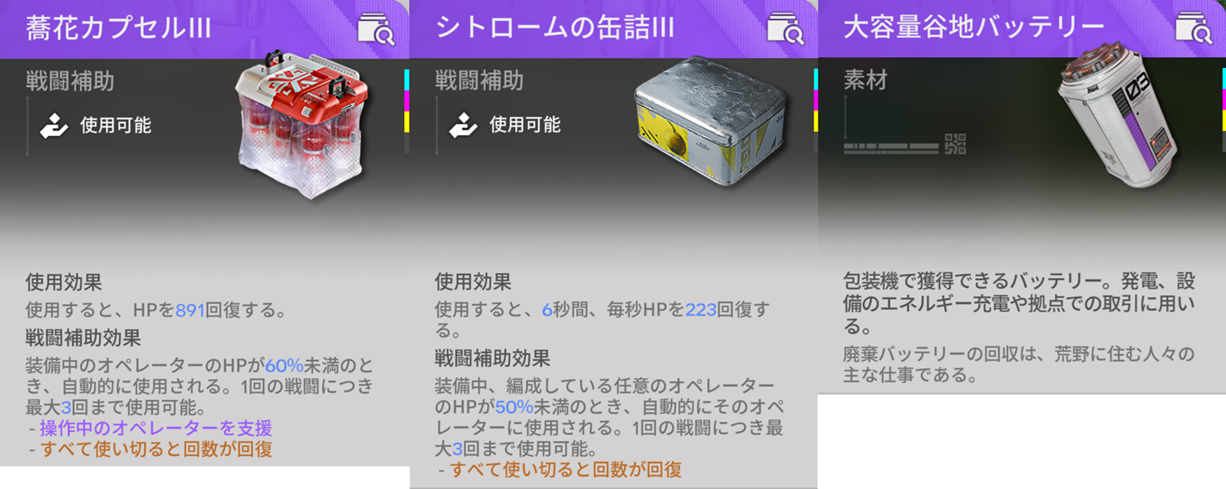 蕎花カプセルⅢやシトロームの缶詰Ⅲについては以下の記事をご参照ください。