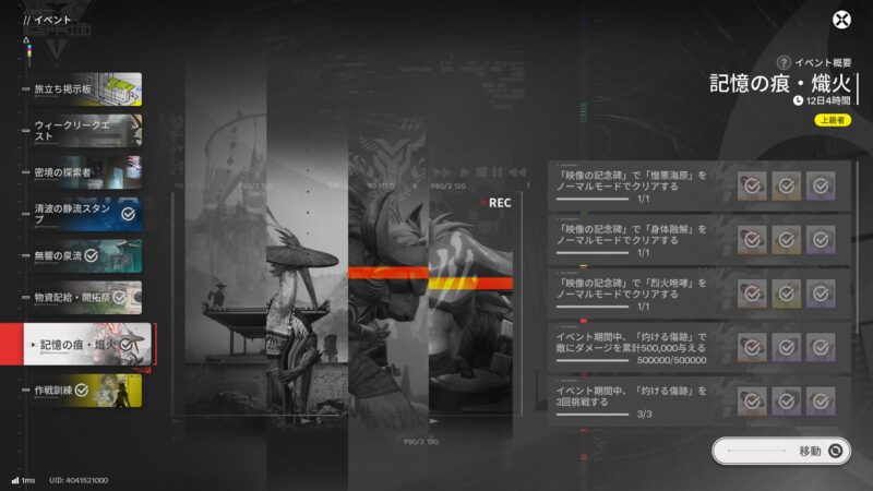 高難易度のバトルイベントである『映像の記念碑:記憶の痕・熾火』にチャレンジすれば、各種報酬がもらえます。