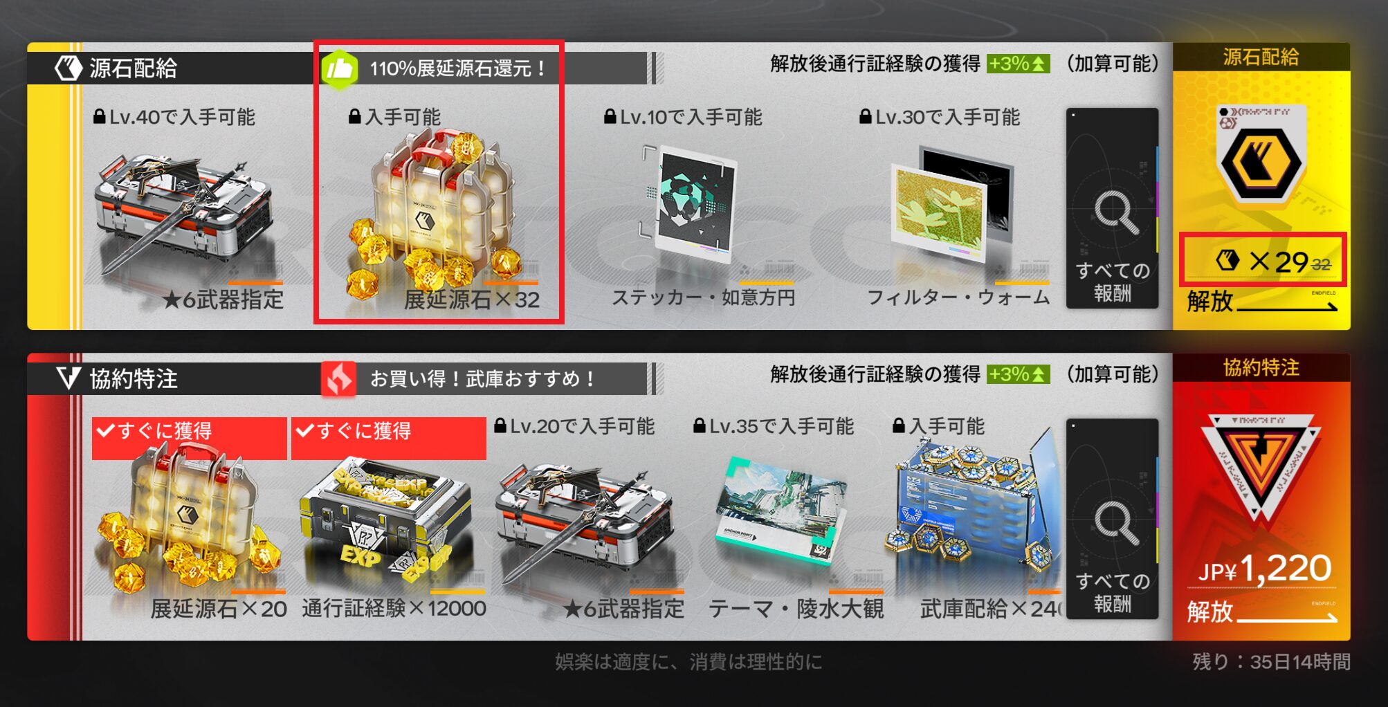 ・源石配給:展延源石(課金石)で解放(多くのアイテムがもらえる)