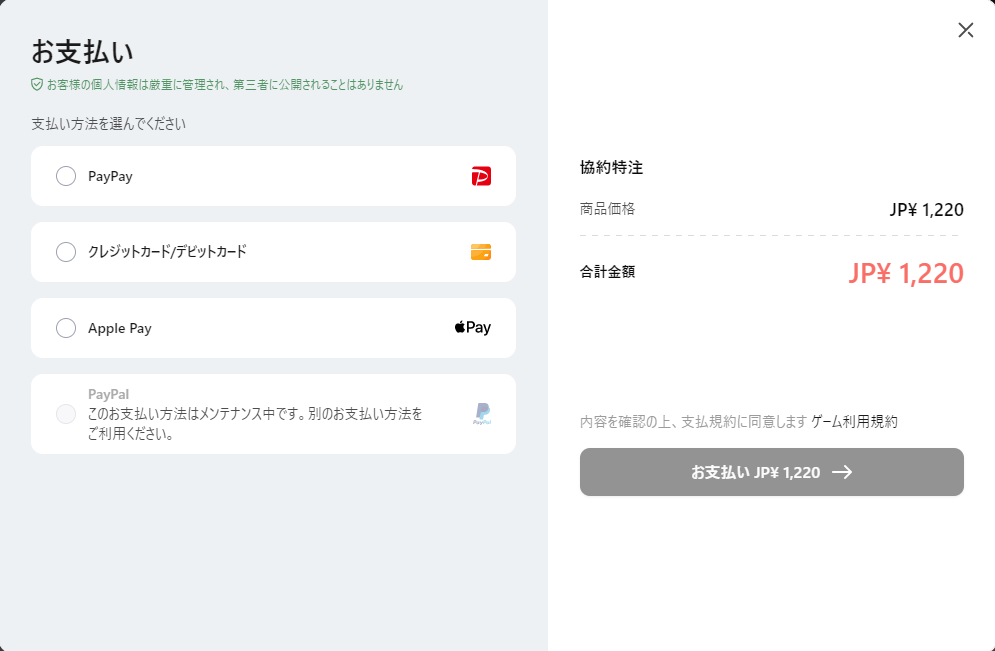 協約特注の解放に必要な金額は1,220円です。