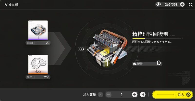 つまり、『理性抽出器1コ+理性120』➔『精粋理性回復剤1コ』に変換することになります。