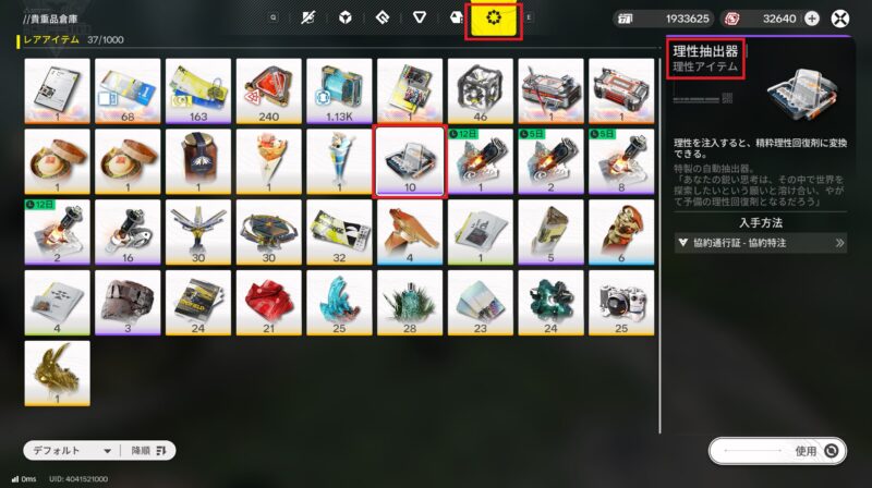アイテム一覧より理性抽出器を選んで、『使用』で進みます。