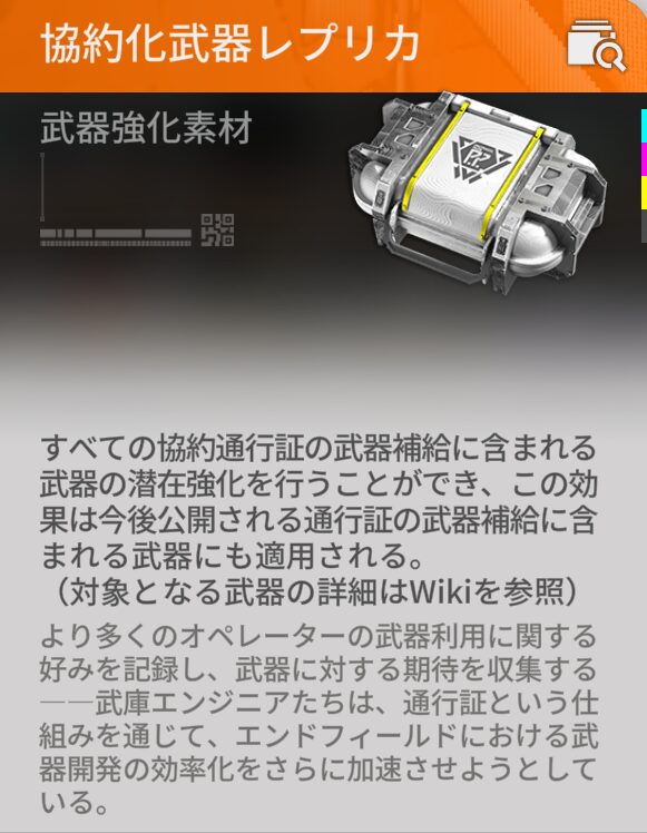 先ほどの武器補給の箱に関連しますが、『協約化武器レプリカ』というアイテムが神がかっています。