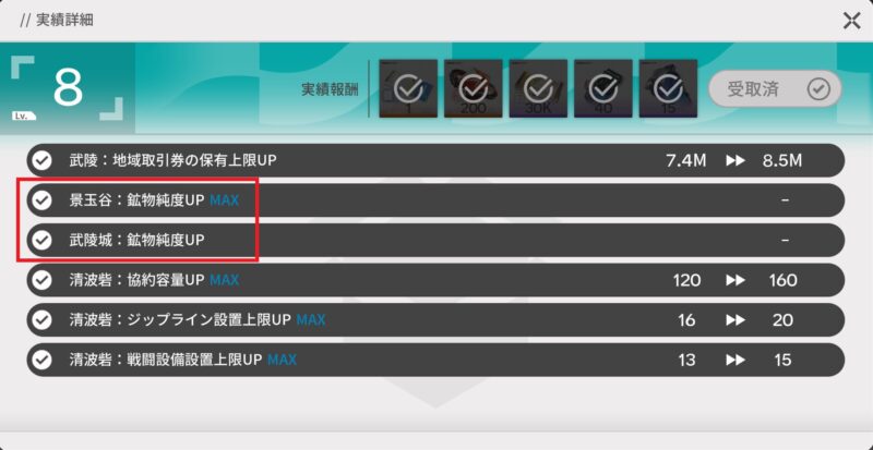 例えば『景玉谷:鉱物純度UP MAX』とあれば、景玉谷すべての鉱物採鉱ポイントで『高純度』になります。