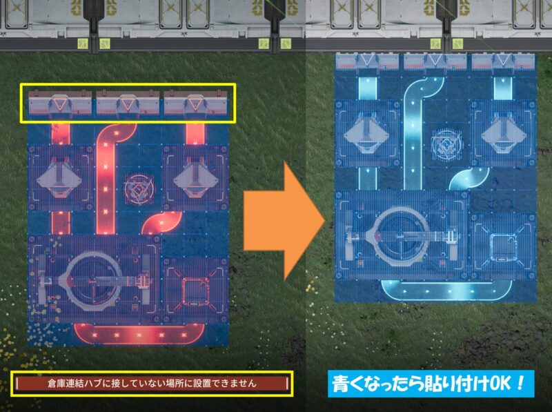 倉庫搬出口が含まれる図面は、倉庫連結ハブに接するように配置してあげてください。