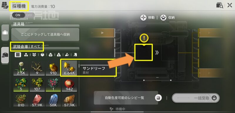 画面ではサンドリーフになっていますが、サンドリーフを投入すれば自動的にサンドリーフの種が生産され、生産ラインが動いていきます。