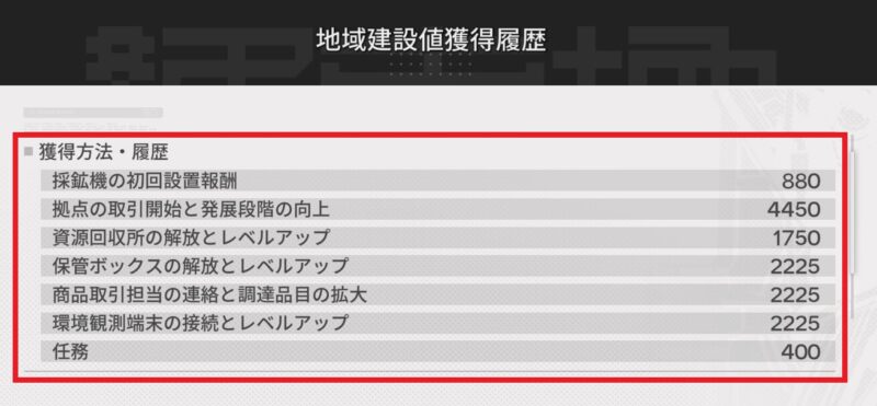 ちなみに地域発展レベルを上げるには『各拠点の解放+その拠点のレベルアップ』『保管ボックスの解放+レベルアップ』『商品取引端末の解放+レベルアップ』などを実行して『地域建設値』という経験値を獲得する必要があります。