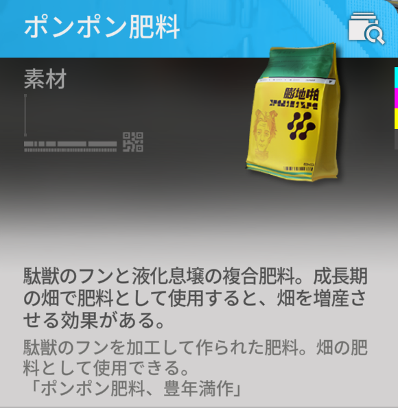 アイテムの説明欄にある通り、ポンポン肥料の材料は駄獣のフンと液化息壌です。