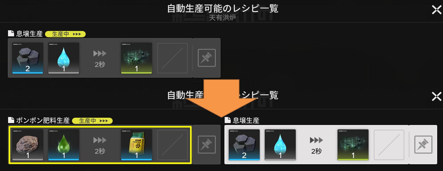 液化息壌:1コ+駄獣のフン:1コ➔天有洪炉(2秒)➔ポンポン肥料:1コ