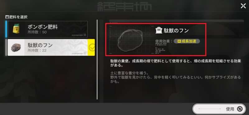 肥料の時と同様にフンを選択し、使用をクリックします。