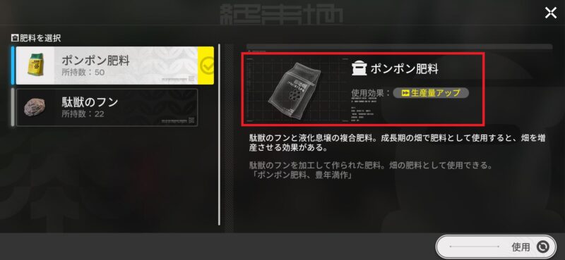 ※ポンポン肥料を選択し、『使用』をクリックします。