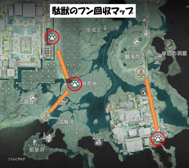 赤い丸の場所にいる駄獣からフンを拾えます。