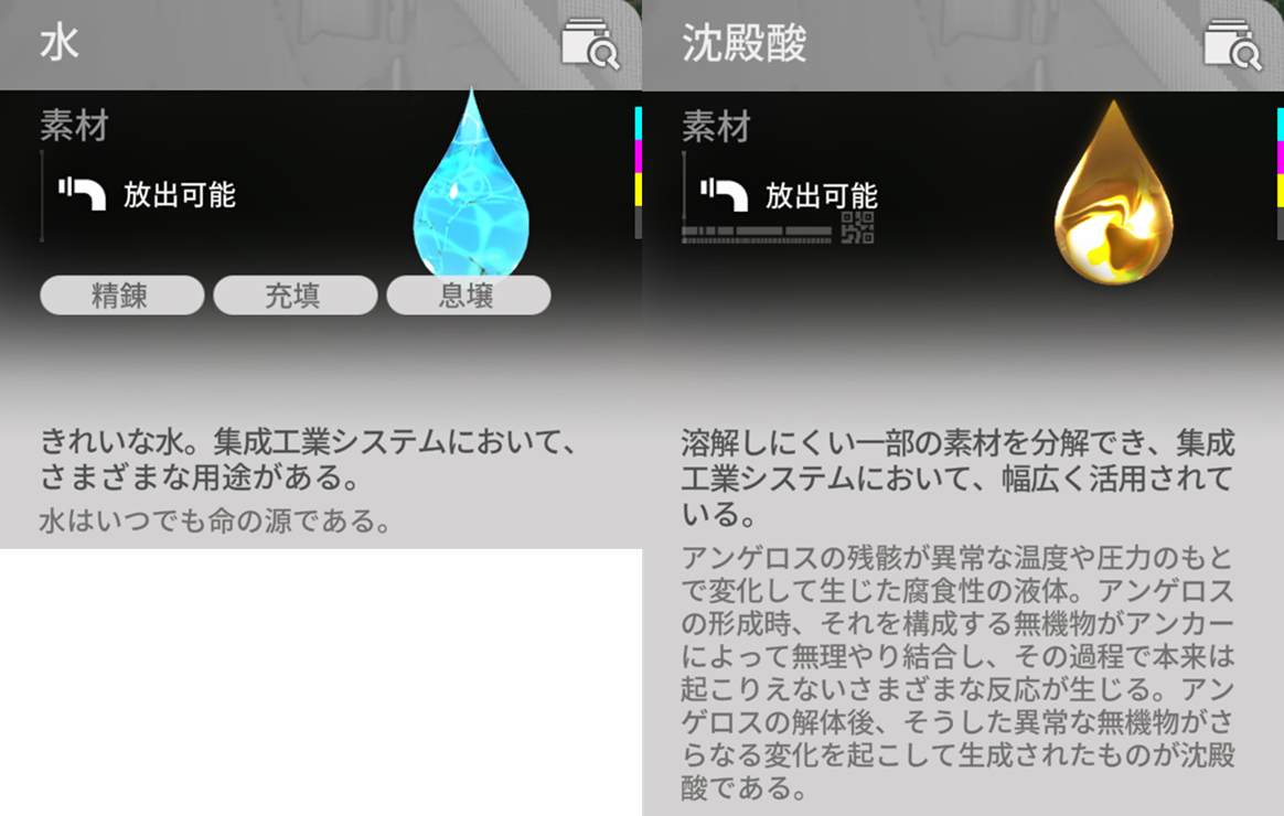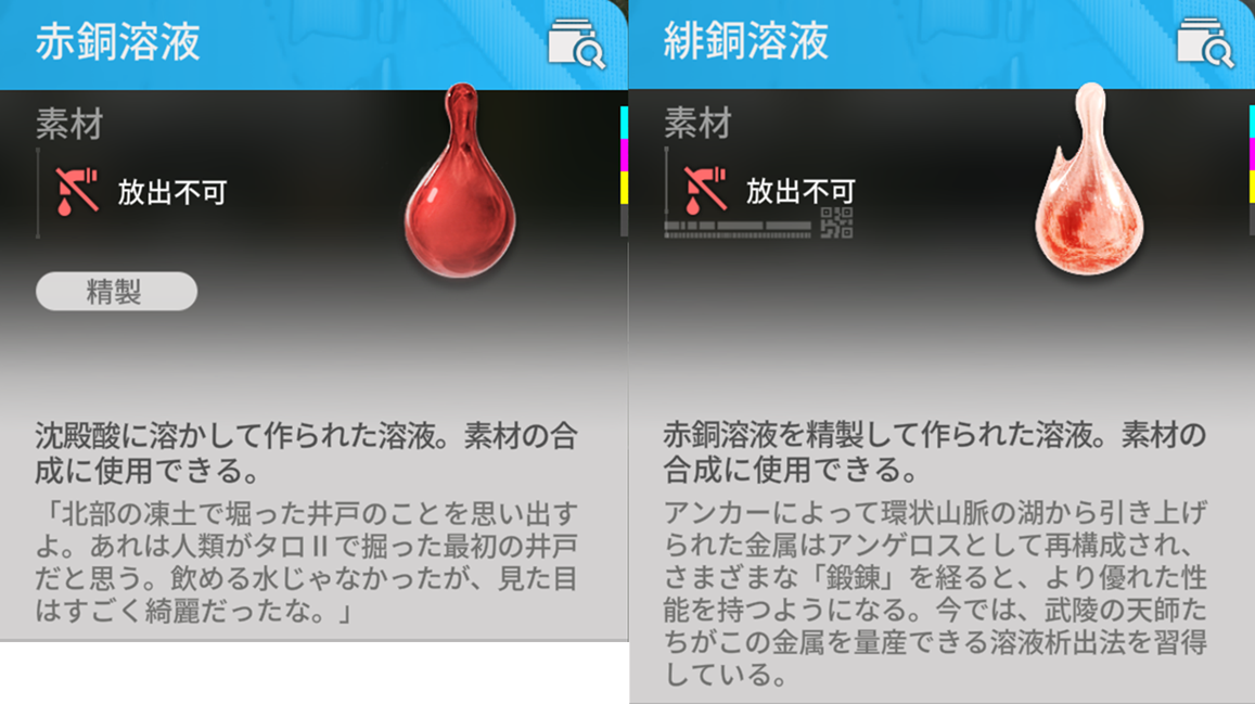 武陵に入ってから液体が数多く出てきていますので、今回の緋銅部品で利用した液体を整理しておきたいと思います。