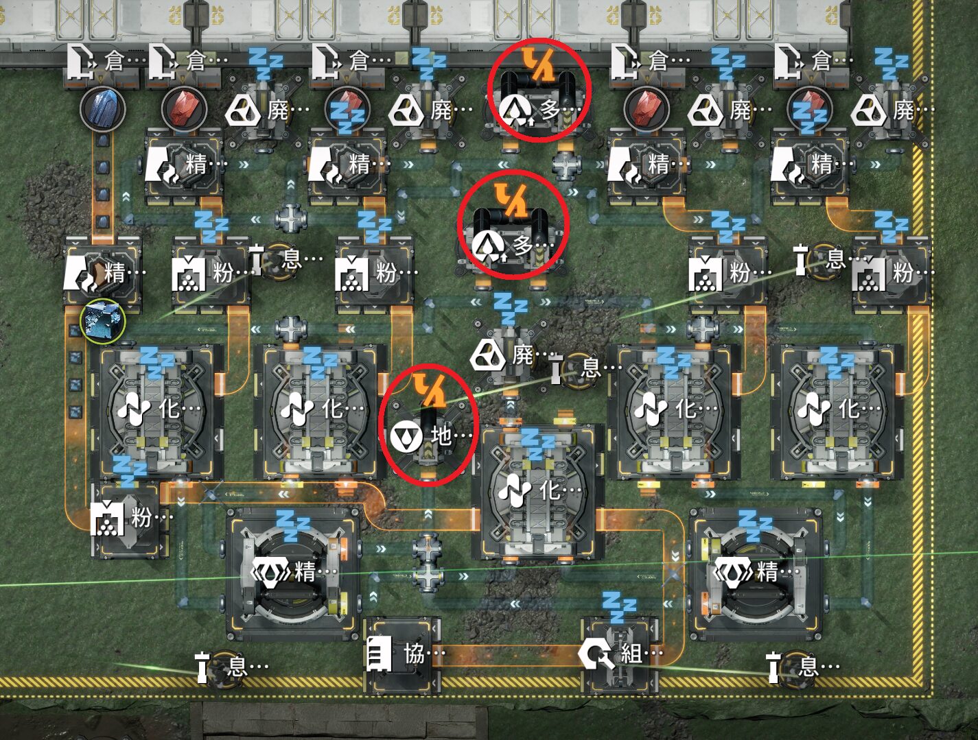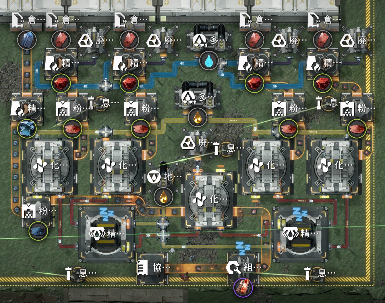 緋銅溶液:2コ+青鉄粉末:1コ➔化学反応炉(2秒)➔緋銅塊:1コ+汚水:1コ ※1レーン
