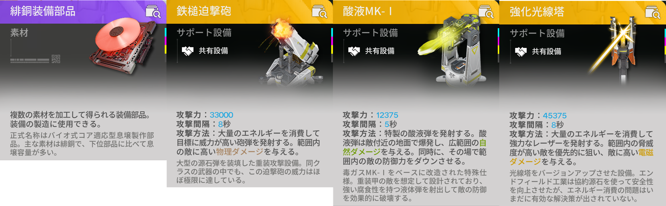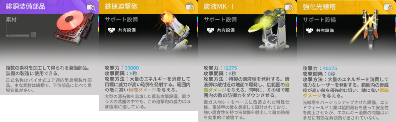 緋銅部品は緋銅装備部品や戦闘サポート設備である鉄槌迫撃砲、酸液MK-I、強化光線塔の材料となります。
