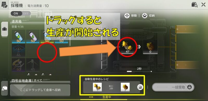 前述しました通り、アイテムを生産するにはサンドリーフを粉末にして使います。