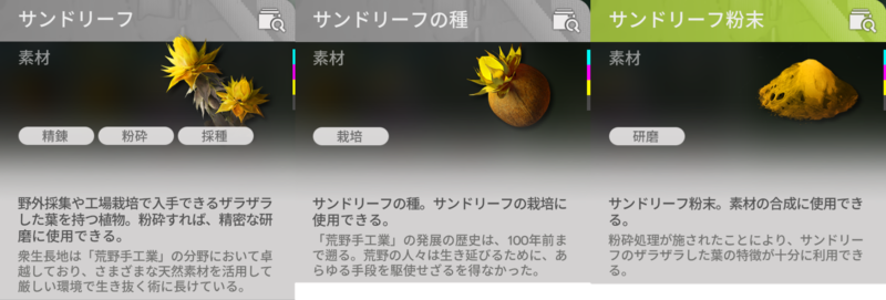 ・サンドリーフ粉末:サンドリーフを粉砕機で砕くと、アイテム生産で使える粉になります。
