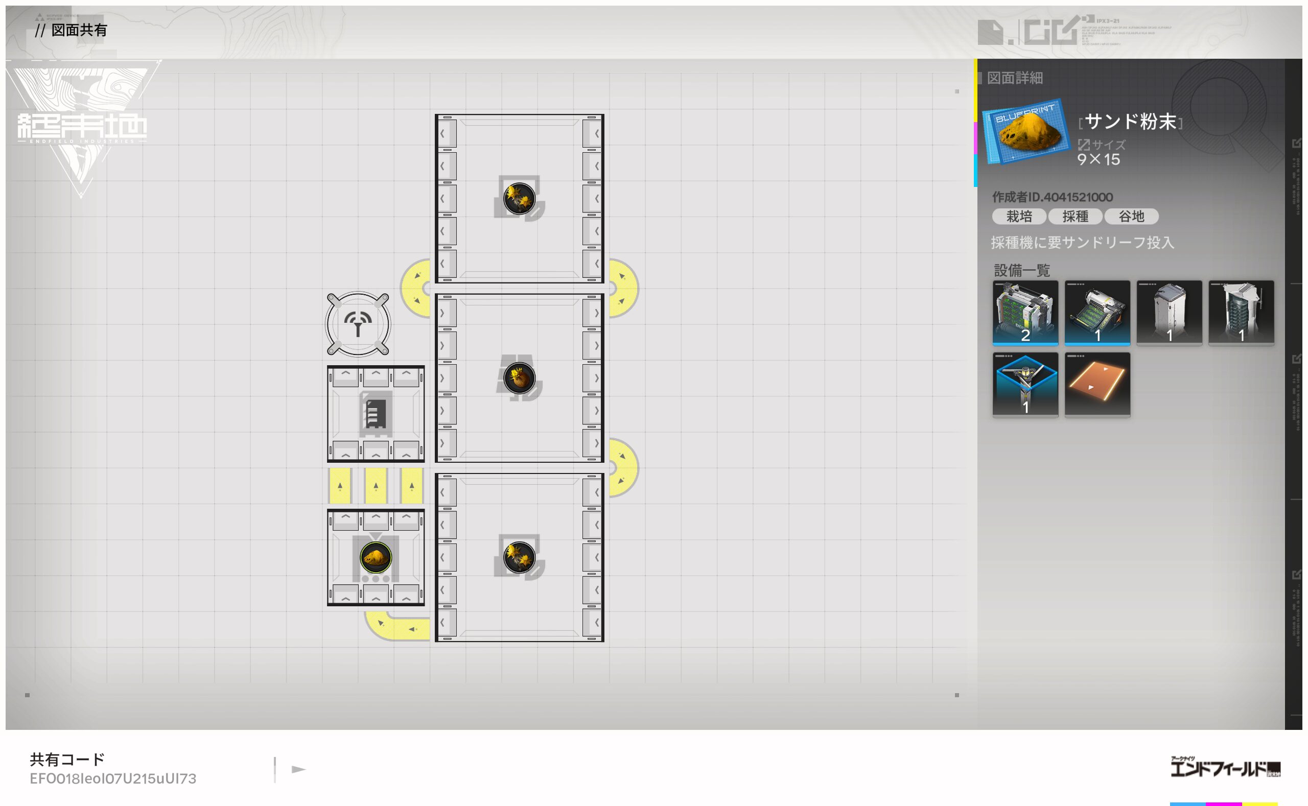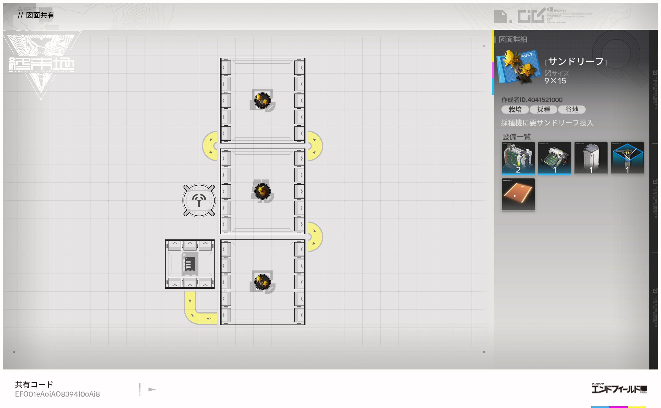 エンドフィールドの特徴の1つとして、図面共有コードを活用すれば、コピペだけで図面を利用できます。